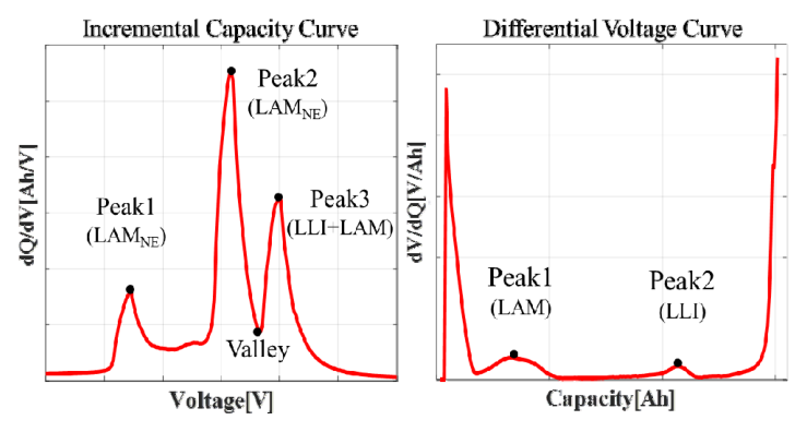 ICA는 충전 및 방전 곡선을 활용하여 리튬 이온 배터리의 전압 변화와 이에 따른 용량 변화를 분석하는 방법이다. 전압이 일정하게 유지되는 구간은 리튬 이온 배터리에 많은 양의 에너지가 추가되는 것을 의미하고, 경사면은 적은 양의 에너지가 추가되는 것과 대응된다. 이러한 특징은 IC 곡선에서 Peak로 나타나는데, 이러한 Peak 위치 변화나 강도 감소는 리튬 이온 배터리의 용량 저하 원인을 파악하는 데 중요한 단서를 제공할 수 있다. 저전압 구간에서는 주로 LAM과 관련되어 있고 중간 전압 구간에서는 전극 간의 비균일한 열화로 인한 Peak 분열 및 생성이 나타나며, 고전압 구간에서는 LLI와 관련이 있다[12]. ICA는 배터리 사용 중 Peak 위치의 이동, Peak 높이의 감소, 또는 새로운 Peak의 출현 등을 통해 배터리 내부의 변화를 나타낼 수 있기 때문에 배터리의 열화 모드를 진단하는 데 매우 유용한 도구이다. 증분 용량 곡선을 추출하기 위해서는 정전류로 충전하거나 방전한 데이터가 필요하다. 특히, 낮은 C-rate는 전압 변화에 더 민감하게 반응하기 때문에 세밀한 전기화학적 반응을 정확하게 포착하기 위해서는 데이터를 낮은 C-rate로 수집하는 것이 중요하다[13]. 수집된 데이터를 기반으로 전압-용량 곡선을 구성할 수 있으며, 이 과정에서 충·방전 전류 데이터를 활용하여 누적 용량을 계산하고 특정 전압에서의 용량 값을 도출할 수 있다. 증분 용량은 전압 변화에 따른 미소 용량 변화를 나타내며, dQ/dV 값을 계산함으로써 그림 2와 같이 IC곡선을 얻을 수 있다. 연속된 데이터 포인트 간의 수치 미분을 통해 증분 용량을 계산할 수 있으며, 이는 다음과 같이 표현된다.