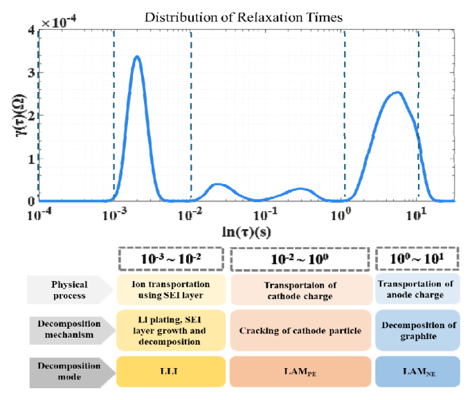 DRT는 EIS 측정을 통한 주파수 응답 데이터에 대하여 시스템 내에서 일어나는 다양한 전기화학적 반응의 시간 상수를 계산하여 분리함으로써, 임피던스 기여도를 시각화하여 분석하는 기법이다. 여기서 시간 상수에 따른 분리란, 그림 3과 같이 시스템 내 다양한 전기화학적 반응들이 서로 다른 시간 척도로 이루어짐을 분석하는 것을 의미한다. 시간 상수는 특정 반응이 일어나는 속도를 나타내며, 이는 주파수 영역에서의 임피던스 응답으로부터 계산된다. 예를 들어, 고속 반응인 전해질 저항과 리튬 이온 이동은 낮은 시간 상수에서 나타나고, 저속 반응인 전극 활성물질 소모나 확산 저항은 높은 시간 상수에서 나타난다. 이러한 방식으로 각 시간 상수에 해당하는 임피던스 기여도를 나타내는 DRT 곡선을 생성하면, Peak의 위치와 크기 변화를 통해 특정 반응 메커니즘이 배터리 열화에 어떻게 기여하는지를 이해하고, 시스템의 복잡한 반응 메커니즘을 더 명확하게 이해함으로써 배터리의 동적 특성을 반영한 분석이 가능하다. 이것은 별도의 모델링이나 모델에 대한 사전 지식 없이 해석이 가능하다는 장점이 있다.