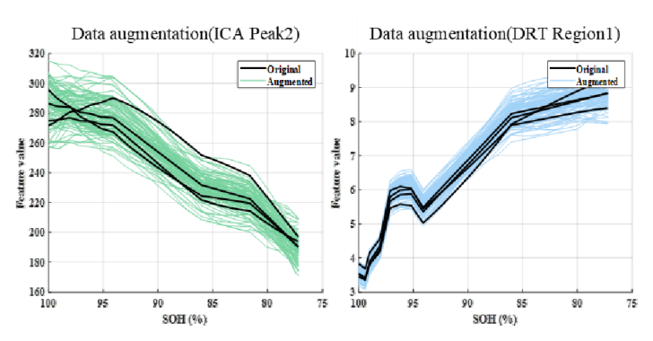 $S(SOH)$는 랜덤 제어점 기반의 스플라인 변형 함수이며, $\sigma$는 변동률(0.05, 즉 ±5%)이다. 이 방식을 통해 특성 인자 곡선의 전반적 감소 혹은 증가 추세는 유지되면서도 국소적인 기울기 변화나 곡선 편차가 부여되어, 실험적 오차나 측정 환경의 미세한 차이를 반영한 현실적인 데이터 다양성을 확보하였다. 그림 5는 추세 보존형 피처 곡선 기반 데이터 생성 결과이며, 대표적 예시로 ICA Peak2와 DRT Region1에 대하여 도식화하였다. 환경별로 4개의 원본 곡선으로부터 96개의 증강 곡선을 추가 생성하여 총 100개의 샘플을 각 특성 인자별로 구성하였으며, 이 데이터셋은 후속의 XGBoost 기반 분류 모델 학습에 사용되었다.