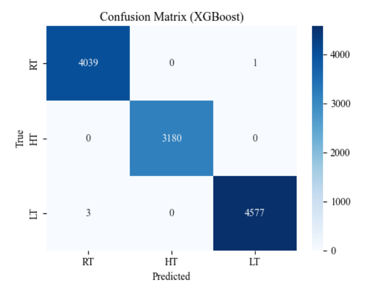 반면, 제안된 XGBoost 기반 모델에서는 세 환경 조건 모두에서 오분류 수가 현저히 감소하였다. RT 조건에서는 전체 4040개 중 1개만 오분류되었고, HT 조건에서는 오분류가 발생하지 않았다. LT 조건은 4580개 중 3개만 오분류되어 모든 환경 조건에서 분류 오류가 0~3개 수준으로 제한되었다. 이러한 결과는 XGBoost가 gradient 기반 손실 최소화와 정규화 항을 포함한 앙상블 학습 구조를 통해 클래스 간 비선형 경계를 보다 정밀하게 모델링할 수 있음을 보여준다.