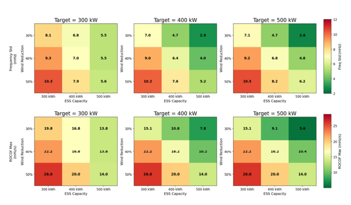 그림 8은 목표 전력, ESS 용량, 풍속감소계수의 조합에 따른 주파수 RoCoF 특성을 히트맵 형태로 나타낸 것이다. 분석 결과, ESS 용량이 증가할수록,